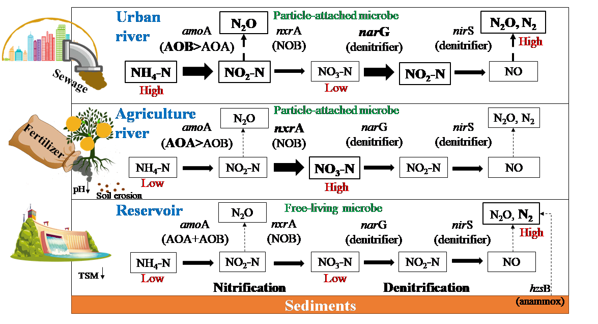 我实验室陈能汪课题组以福建省九龙江流域为研究对象,通过丰水期和枯水期的多学科参数观测和室内实验,运用分子生物学技术,对比分析城市、农业和水库三种类型河段的营养盐形态和氮功能基因的属性差异,探明不同类型河段(反映不同的人为干扰)硝化与反硝化微生物的生态位和脱氮效应。主要研究发现有: