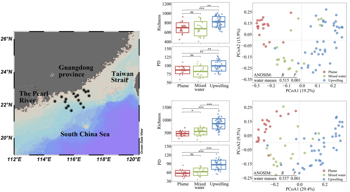 河口羽流区与近岸上升流区是海-陆界面相互作用中最重要、最典型的两个区域。河口羽流-上升流耦合系统接受大量河流径流的同时,受海水涌升等物理过程的强烈影响,系统中微生物群落与环境因素之间关系尤为复杂。以往研究多关注非生物因素对原核类群的影响,对物理过程、生物因素与非生物因素如何相互作用,驱动河口羽流-上升流耦合系统中微生物组分布模式,知之甚少。