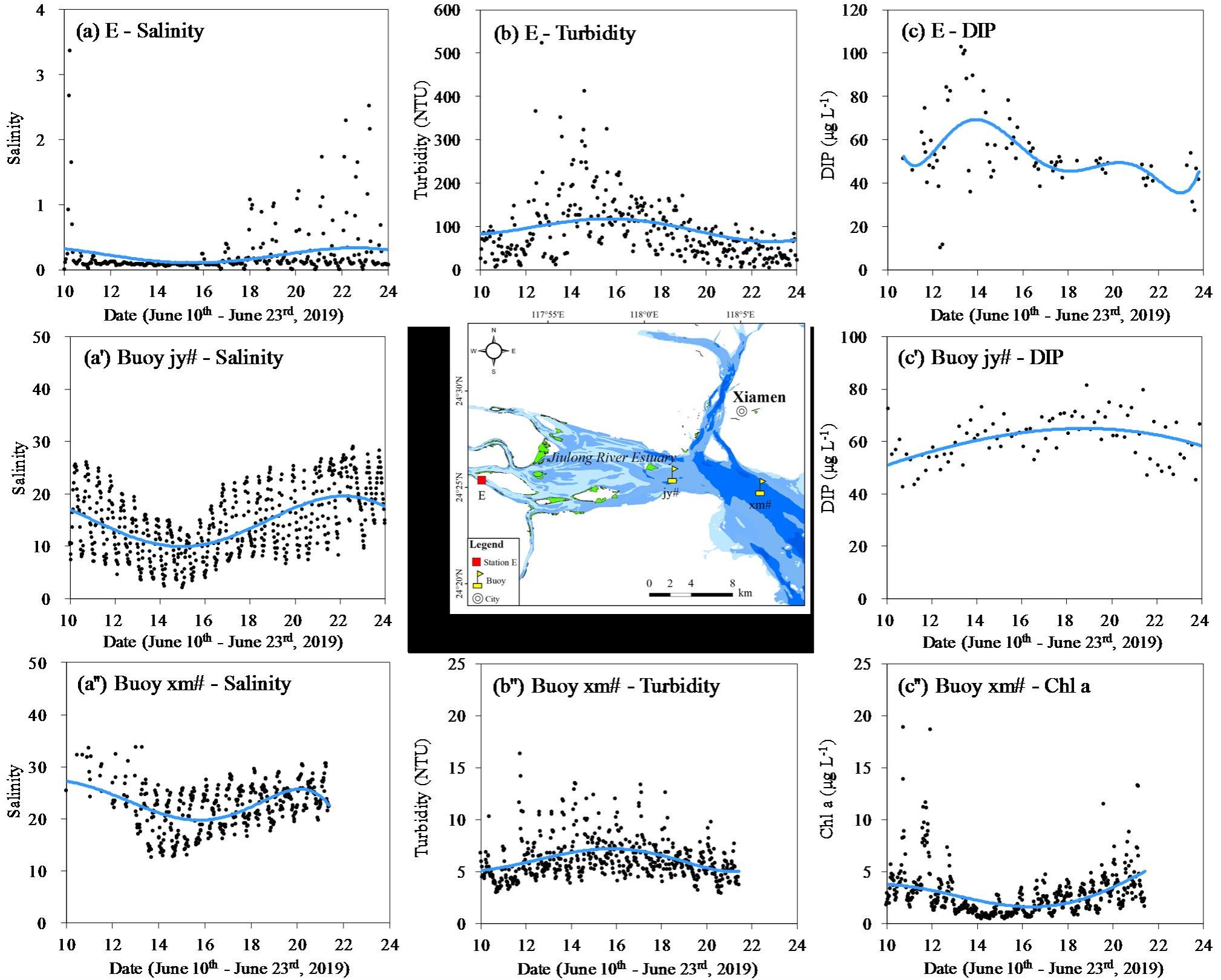 注:E为九龙江口上游最大浑浊带站位,jy#和xm#分别为九龙江口(鸡屿)站位和厦门湾南部海域浮标站位