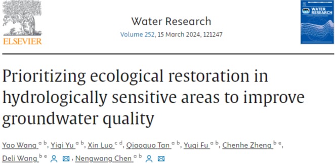 Wang, Y., Yu, Y.Q., Luo, X., Tan, Q.G., Fu, Y.Q., Zheng, C.H., Wang, D.L.* and Chen, N.W.* (2024) Prioritizing ecological restoration in hydrologically sensitive areas to improve groundwater quality. Water Research, 252: 121247.