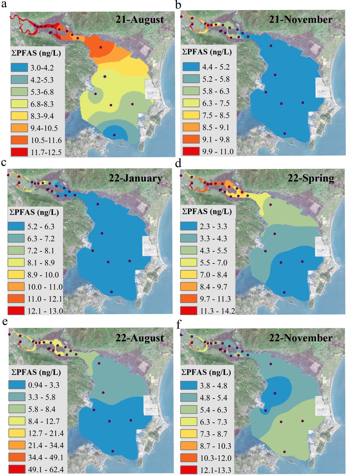 依托福建台湾海峡海洋生态系统国家野外科学观测研究站(简称“台海站”),研究团队进一步以一个典型的亚热带河流-红树林河口-海湾连续系统(漳江-漳江口-东山湾)作为研究区域,通过6次季节性采样获取水样并进行25种PFAS化合物的检测分析,通过对河流-红树林河口-海湾系统PFAS空间分布、季节变化分析以及利用正定矩阵因子模型确定该研究区域PFAS的主要污染来源,发现了浙闽沿岸流对漳江口和东山湾PFAS分布的季节性影响,为红树林河口污染物的研究及保护奠定了一定的理论基础。