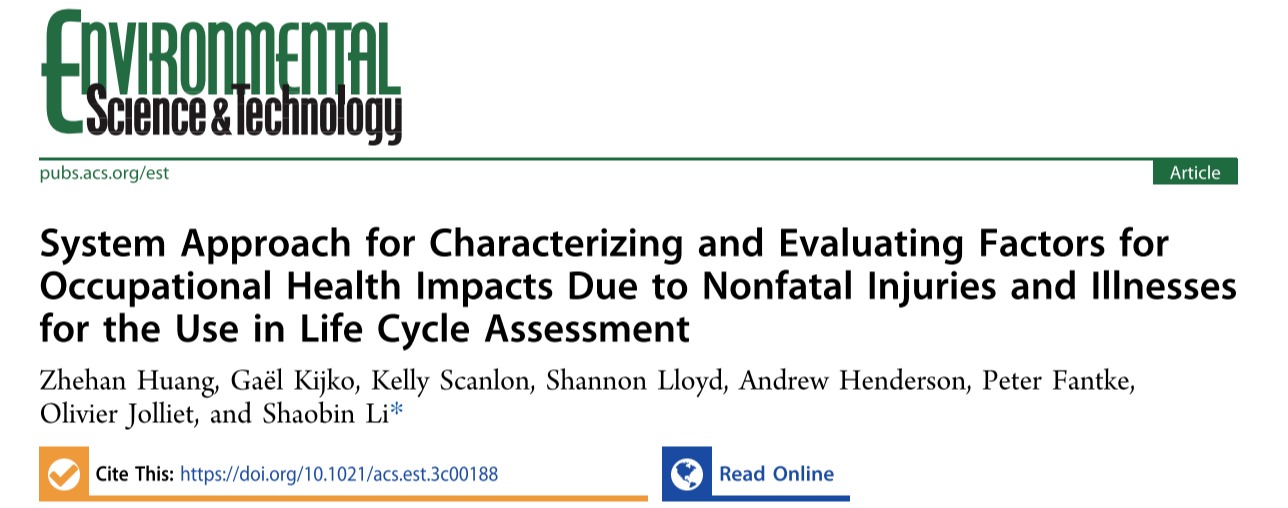Huang, Z., Kijko, G., Scanlon, K., Lloyd, S., Henderson, A., Fantke, P., Jolliet, O., Li, S., 2023. “System approach for characterizing and evaluating factors for occupational health impacts due to nonfatal injuries and illnesses for the use in life cycle assessment.” Environmental Science & Technology, https://pubs.acs.org/doi/10.1021/acs.est.3c00188