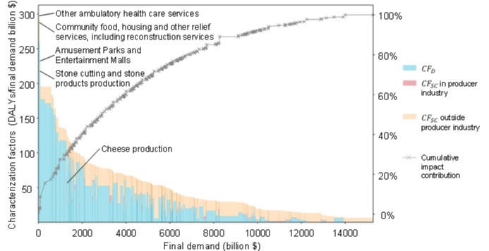 图2. 美国397个产业的职业健康影响产业链特征因子(Characterization factors,CFs)。x轴的宽度表示该产业的最终需求,柱面积由该产业的职业健康影响特征因子(y轴)与其最终需求(x轴)的乘积得到,表示该产业职业健康总影响(Total DALYs)。
