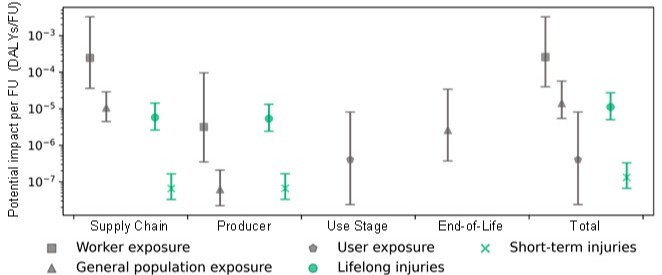 图3. 在不同生命周期阶段中不同健康风险造成的人群健康影响对比。其中包括工人和使用者接触化学品造成的影响、一般人群化学暴露的影响以及职业健康影响。图中绿色部分为该研究的工作,灰色部分来自于文献(Kijko et al. 2016, ES&T, 50, 13105-13114)。误差棒为95%置信区间。