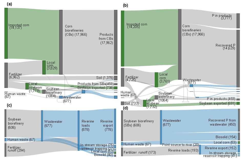 该研究从流域“粮食-能源-水”关联系统视角,以农业、工业并重的Upper Sangamon River Watershed(位于美国玉米带流域)为研究区域,应用自主开发的“环境-经济-技术”耦合模型(Li et al. 2021, Environmental Modelling and Software, 143, 105083),在流域尺度量化表征农业管理实践和环境与生物工程技术(以污水处理厂磷去除和回收、玉米生物提炼厂磷回收为代表)的磷回收潜力及其对磷循环过程的影响。进一步结合多目标优化算法,以分布式农业管理实践和环境与生物工程技术为决策变量,探索流域尺度下磷回收潜力、水质提升、粮食产量、经济效益的多维效应。该研究有助于提升流域尺度“粮食-能源-水”关联系统协同演变的科学认知,助力绿色经济与可持续发展。