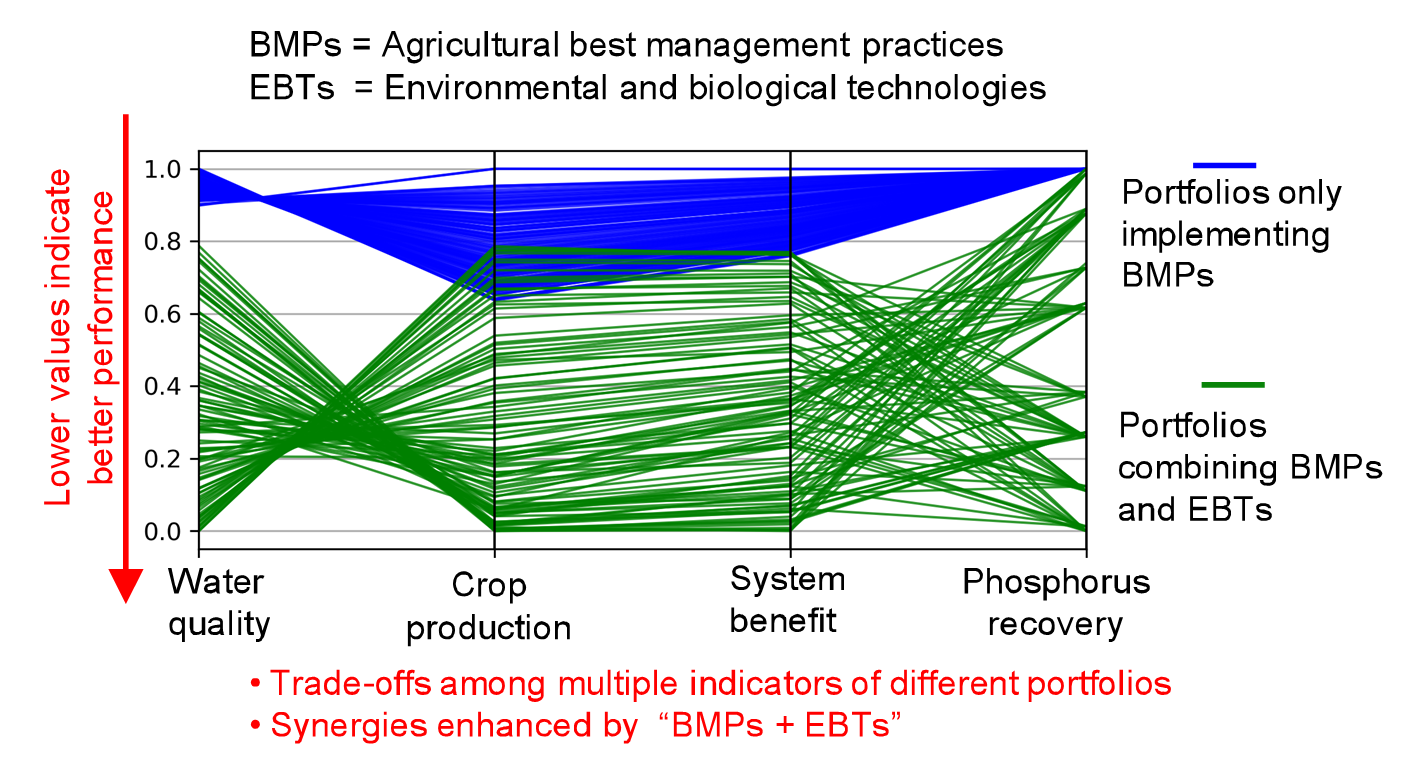目前农业最佳管理实践(BMPs)和环境与生物工程技术(EBTs)对流域“粮食-能源-水”协同调控作用尚未明晰。该研究在两种情景下(1. “BMPs only”情景;2. “BMPs + EBTs”情景)分别用多目标优化算法寻找最优组合,研究发现工程技术和农业管理实践的结合有助于同时提升水质、作物产量、系统经济、磷回收潜力,阐明了分布式农业管理实践(包含冬季覆盖作物、植被过滤带、减少肥料用量、土地利用变化(能源作物)组合) + 污水处理厂强化生物除磷工程技术 + 玉米生物提炼厂磷回收工程技术的多措施优化组合方案对实现“粮食-能源-水”多目标协同优化的调控作用(图3)。
