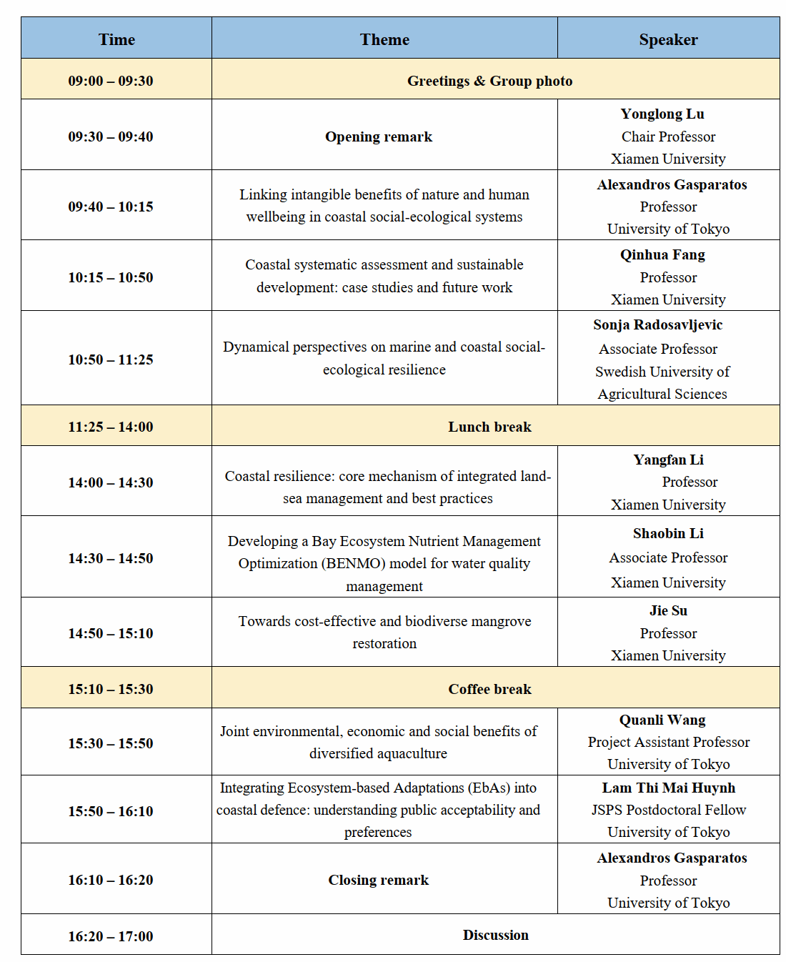Coastal regions are very dynamic and contain highly biodiverse ecosystems that provide multiple ecosystem services, contributing significantly to livelihoods and human wellbeing. However, coastal regions also face increasing pressures from climate change, habitat degradation, pollution and resource overexploitation. This international workshop will explore critical aspects of coastal social-ecological systems sustainability. It is organized jointly by the College of the Environment and Ecology (Xiamen University) and the Institute for Future Initiatives (University of Tokyo), bringing together a very interdisciplinary group of researchers to share new insights and approaches for coastal sustainability. The presentations will explore how interdisciplinary science can inform coastal climate change adaptation, ecosystem restoration, and sustainable management. By integrating ecological, socioeconomic, and technological perspectives, the workshop seeks to foster collaboration across disciplines and regions, identify emerging research frontiers, and promote innovative solutions that enhance resilience, equity, and long-term sustainability at the land–sea interface.