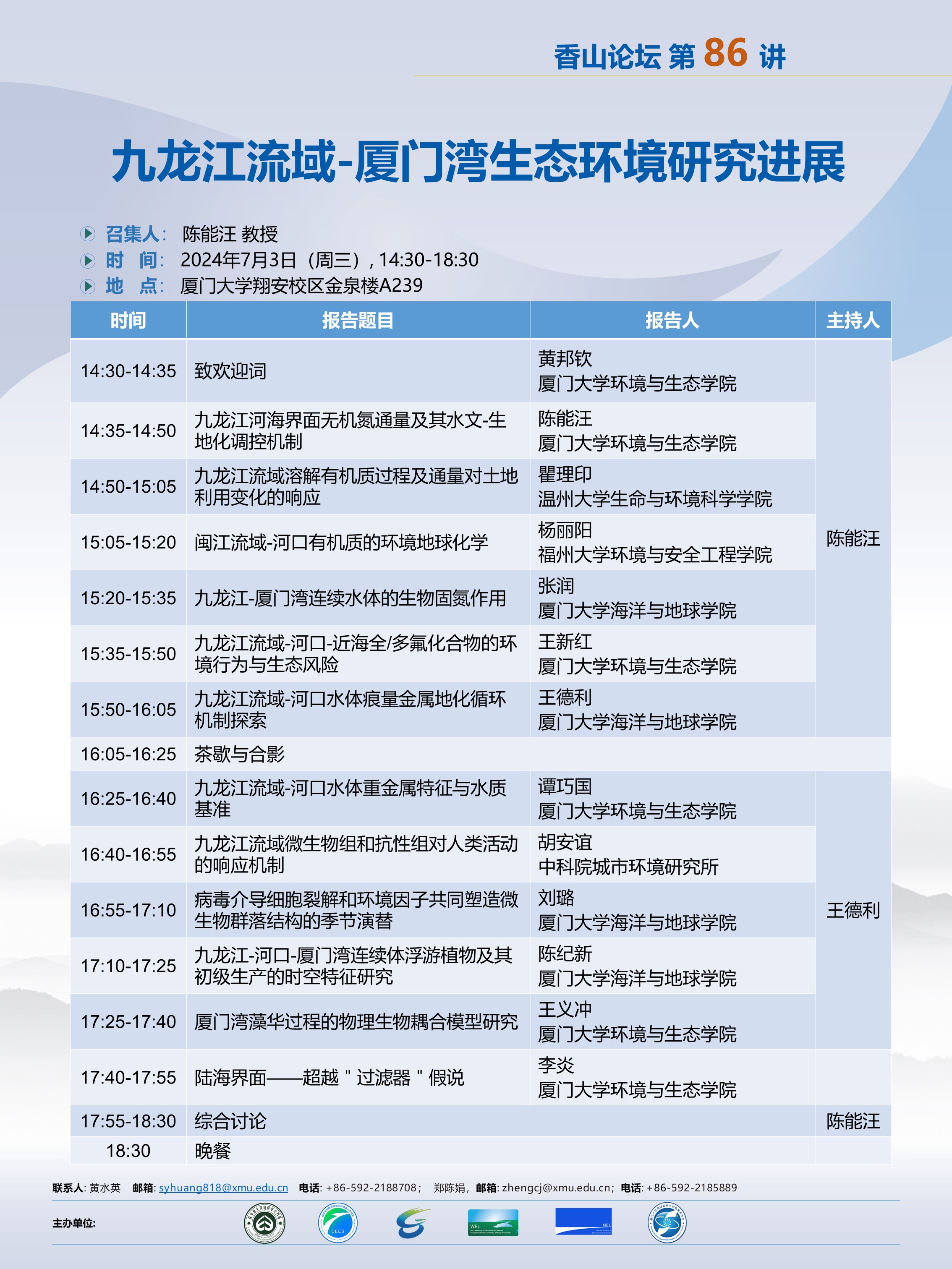 本期论坛以“九龙江流域-厦门湾生态环境研究进展”为主题,诚挚邀请广大师生面对面交流,分享最新的研究成果,凝练关键的科学问题,并激发创新思维。我们期望通过此次论坛,促进跨学科交叉合作,共同产出具有高水平的研究成果。论坛结束后,拟邀请感兴趣的研究小组共同撰写《九龙江流域-厦门湾生态环境演变》专著。