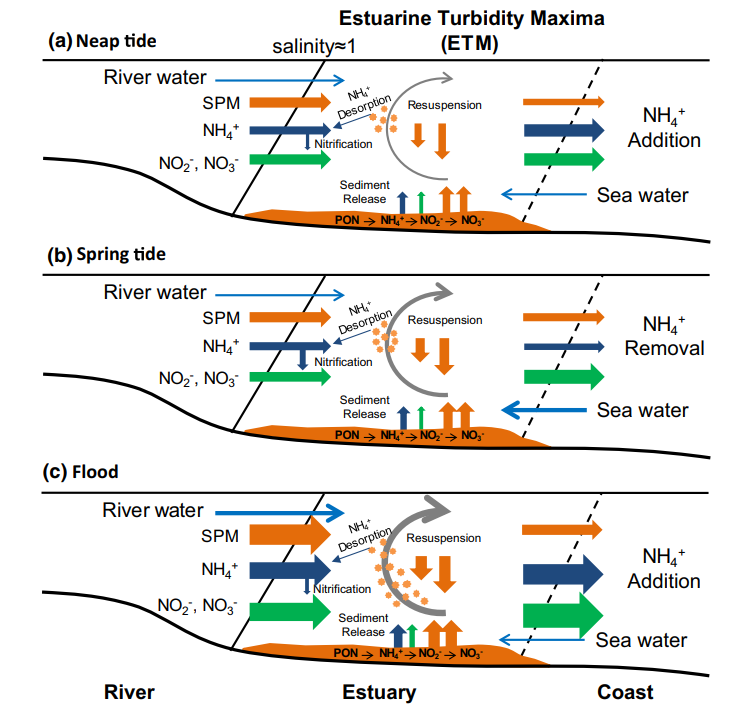 该项研究重点考察河海界面水沙关系及其对氨氮的转化与向海输出通量的影响。综合了精细的水文测量与生物地球化测量数据,初步探明潮流(大潮、小潮)驱动的悬浮颗粒为载体的氨氮去除过程(硝化、颗粒吸附)和添加过程(沉积物释放)的平衡关系。同时关注气候变化背景下极端天气事件(暴雨洪水)对河口无机氮向海输出的重要影响。研究结果可为流域-近海营养盐污染综合治理提供理论参考。