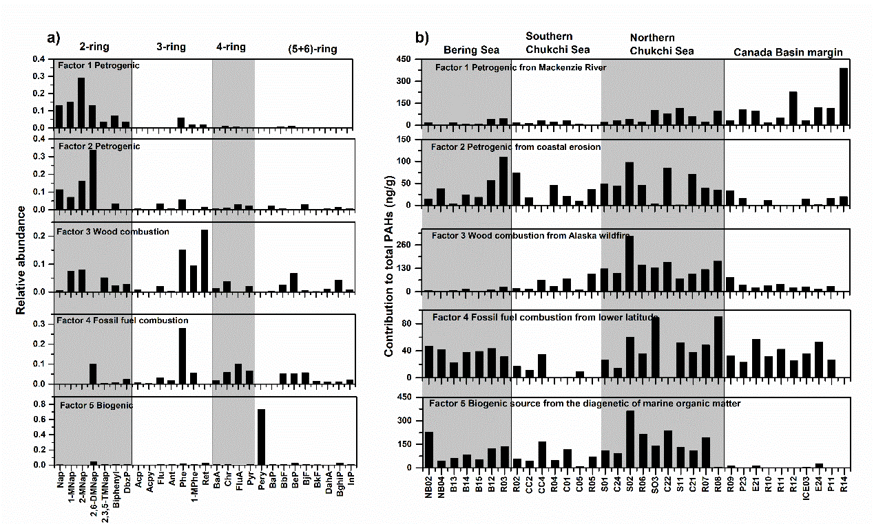 五个来源的组分分布及其对白令海北部-楚克其海沉积物中PAHs贡献的空间分布图(a:化合物按环数由低到高排列,b:站点按纬度由低到高排列)