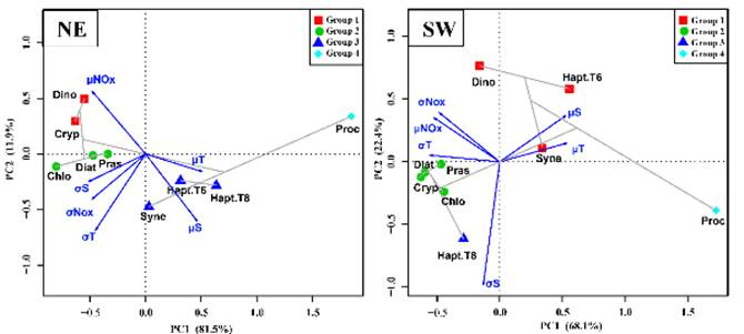 台湾海峡东北(NE)和西南(SW)季风浮游植物与环境参数生态位PCA图