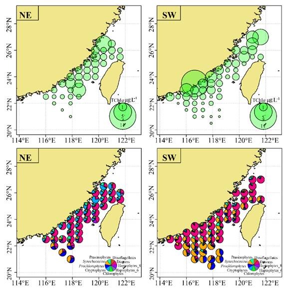 台湾海峡东北(NE)和西南(SW)季风期浮游植物生物量与群落结构