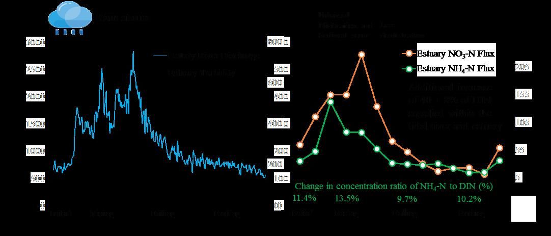 洪水过程导致九龙江河流-河口连续体浊度表征的颗粒物、氨氮和硝氮浓度与通量发生显著变化(图1)。期间径流量快速增加,导致河口淡-咸水交汇界面(形成最大浑浊带的区域)向下游移动,快速改变了悬浮颗粒物(SPM)的空间分布和河口浊度最大值的位置。河流站位SPM和无机氮浓度的增加,与流域土壤侵蚀、土地利用和河床冲刷有关。观察整个洪水过程,河口站位的氨氮到达峰值的速度比硝氮到达峰值的速度更快,这与两种形态氮的来源与水文输移路径(地表与地下)不同有关。从流域出口(河流)到河口最大浑浊带之间(感潮河段与河口上游),溶解无机氮通量增加了约40%,推测其主要来自沉积物的再悬浮和沿岸面源污染输入(含地下水输入)。基流状态下,河口无机氮的主要形态为硝氮,而洪水期间氨氮和硝氮均有所增加,氨氮占无机氮比例在涨水期因初期雨水冲刷效应有所增加,在退水之后因稀释效应下降(图1)。基于氮的各个形态浓度、氮氧双同位素和氮功能菌基因丰度数据分析,发现洪水过程导致河口水中的硝化作用有所增强,但反硝化作用明显减弱。