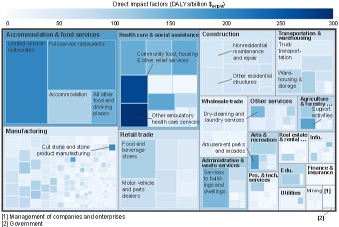 图1. 美国397个产业部门的职业健康影响直接特征因子(Direct CFs)。其中,方格大小表示不同产业的职业人群健康影响总量,方格颜色深浅表示职业人群健康影响强度(DALYs/$,颜色越深则越大)。