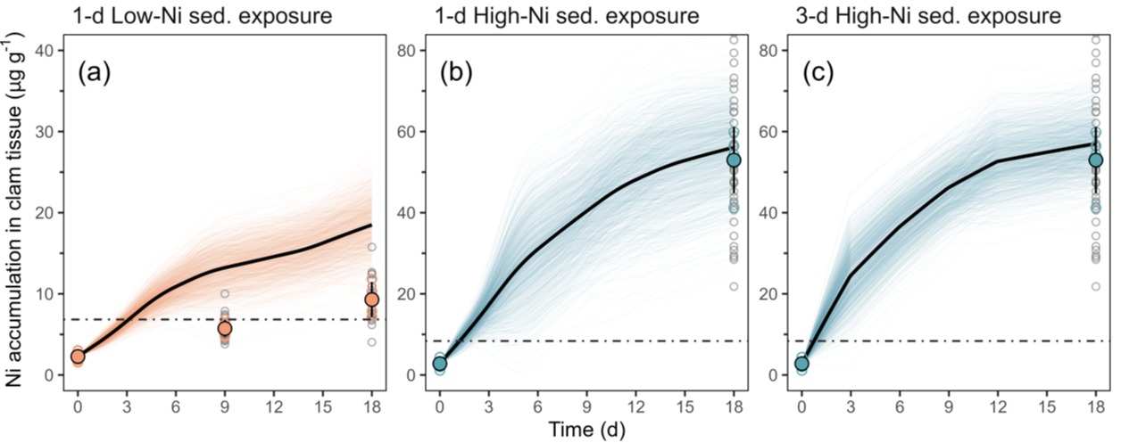 图2. 利用直接测定的镍吸收速率作为参数,将其代入生物动力学模型,成功预测金属的长期生物累积。