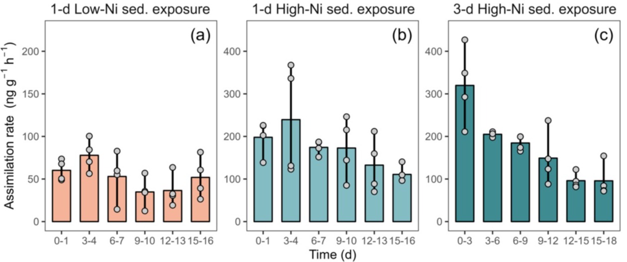 图1. 不同暴露模式(污染程度+暴露时间)下,生物在沉积物中吸收镍的速率。