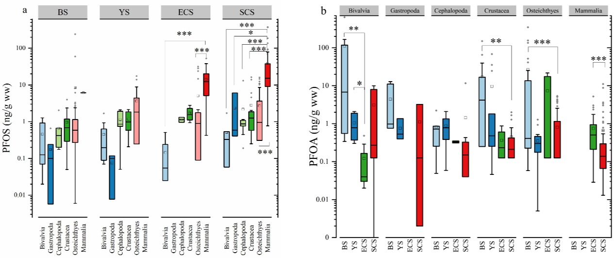 图1 中国沿海海洋生物PFOS(a)和PFOA(b)的分布差异