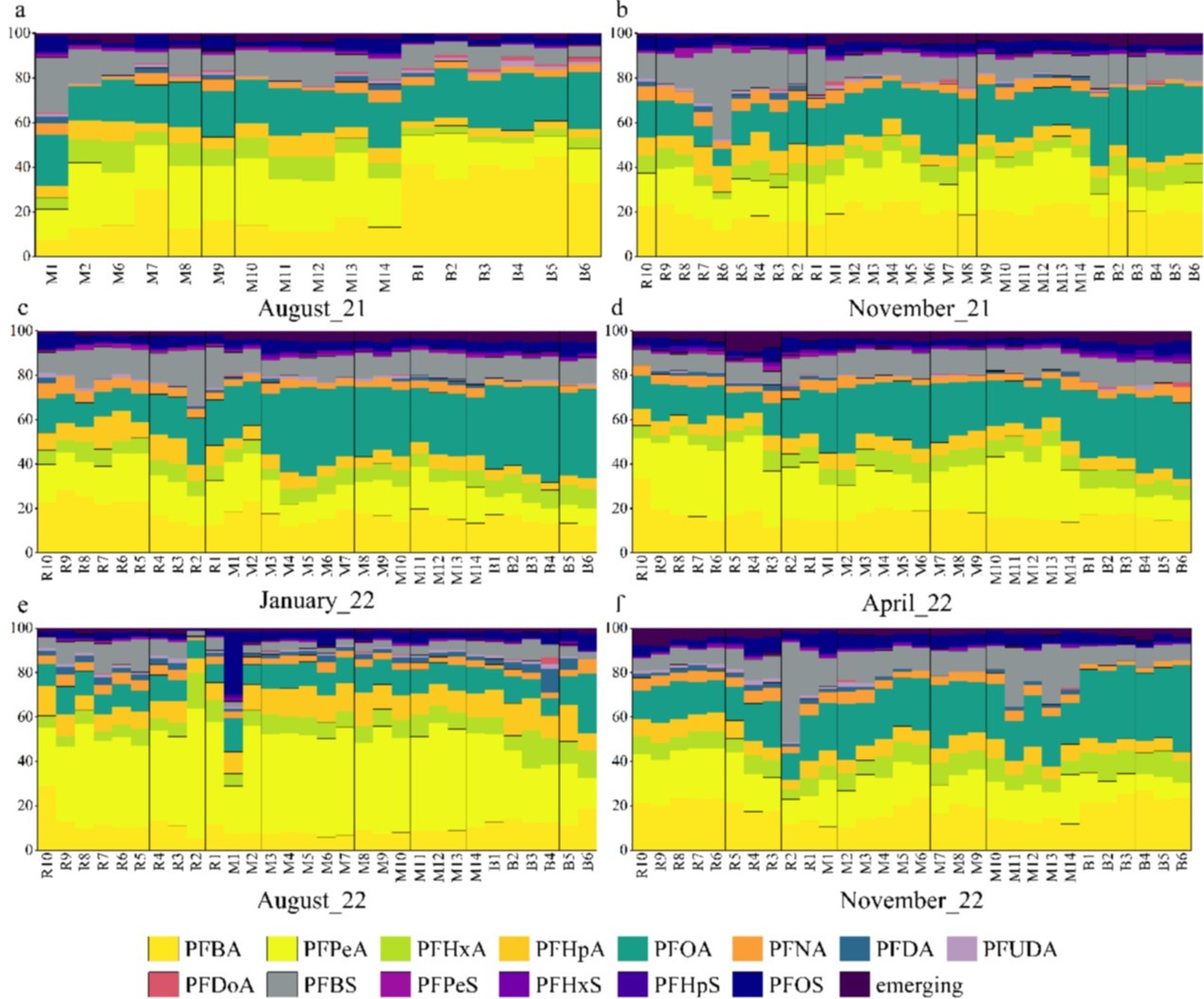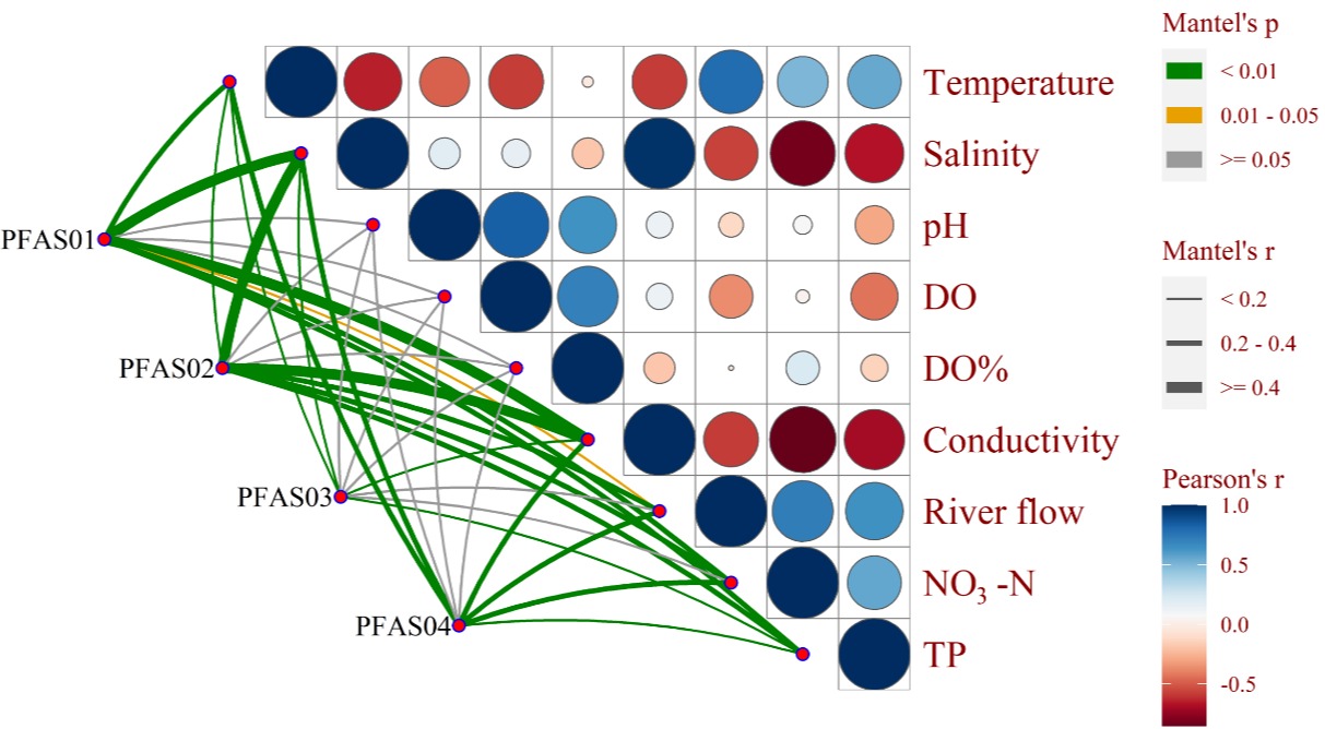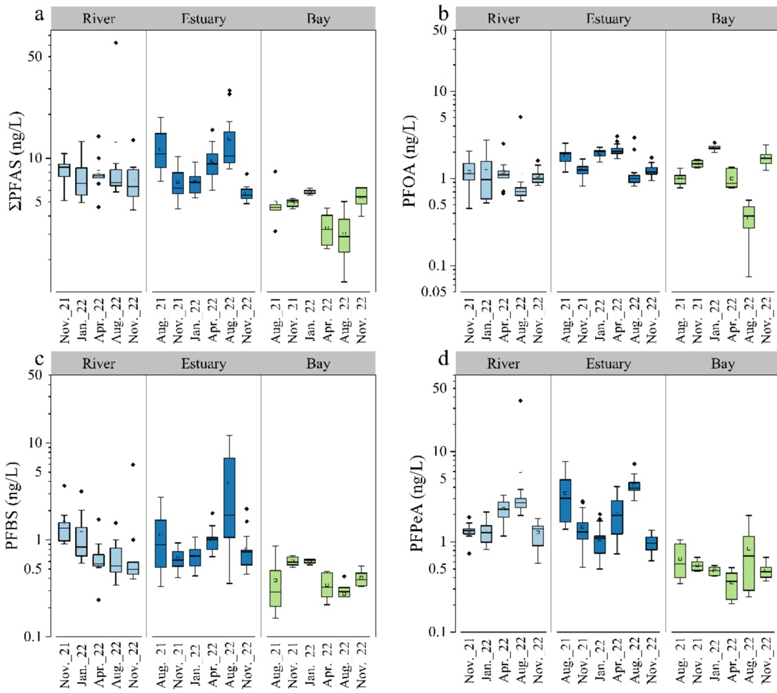 依托福建台湾海峡海洋生态系统国家野外科学观测研究站(简称“台海站”),研究团队进一步以一个典型的亚热带河流-红树林河口-海湾连续系统(漳江-漳江口-东山湾)作为研究区域,通过6次季节性采样获取水样并进行25种PFAS化合物的检测分析,通过对河流-红树林河口-海湾系统PFAS空间分布、季节变化分析以及利用正定矩阵因子模型确定该研究区域PFAS的主要污染来源,发现了浙闽沿岸流对漳江口和东山湾PFAS分布的季节性影响,为红树林河口污染物的研究及保护奠定了一定的理论基础。
