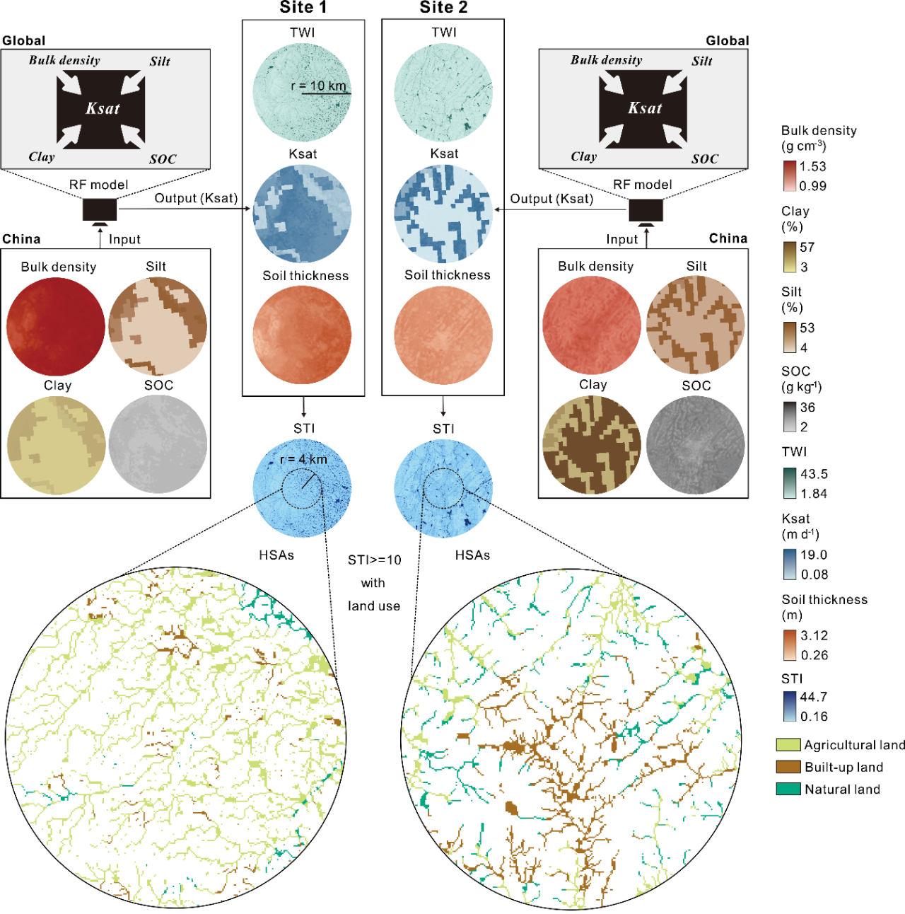 随后,结合全球和国家土壤属性数据库,应用机器学习方法(随机森林),外推了取样站位周边土壤饱和导水率的分布,进一步基于地理空间分析获取了水文敏感区的空间分布(图2)。