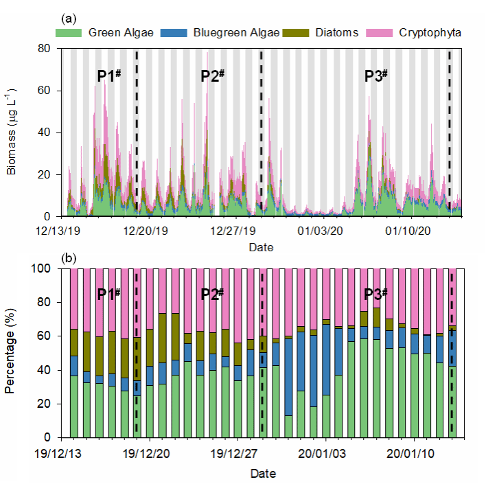 研究发现,氨氮(NH4-N)浓度呈现明显的昼夜波动特征,即日间下降,夜间上升(图1),而藻类生物量却呈现相反的变化趋势,即日间上升,夜间下降(图2)。在一个昼夜周期,氨氮浓度与总藻生物量呈显著负相关(r=-0.378,p=0.028),表明藻类生物量增长与氨氮同化吸收存在关联。硝酸盐(NO3-N)和亚硝酸盐(NO2-N)浓度则无明显的昼夜波动特征。此外,在流域经历了长达75天干旱/少雨状态后,一次中小型降雨事件导致日均氨氮浓度上升了2.4倍,表明降雨导致的外源氮输入负荷增加是水库无机氮浓度上升的主要原因,尤其是在经历了较长时间干旱期之后。