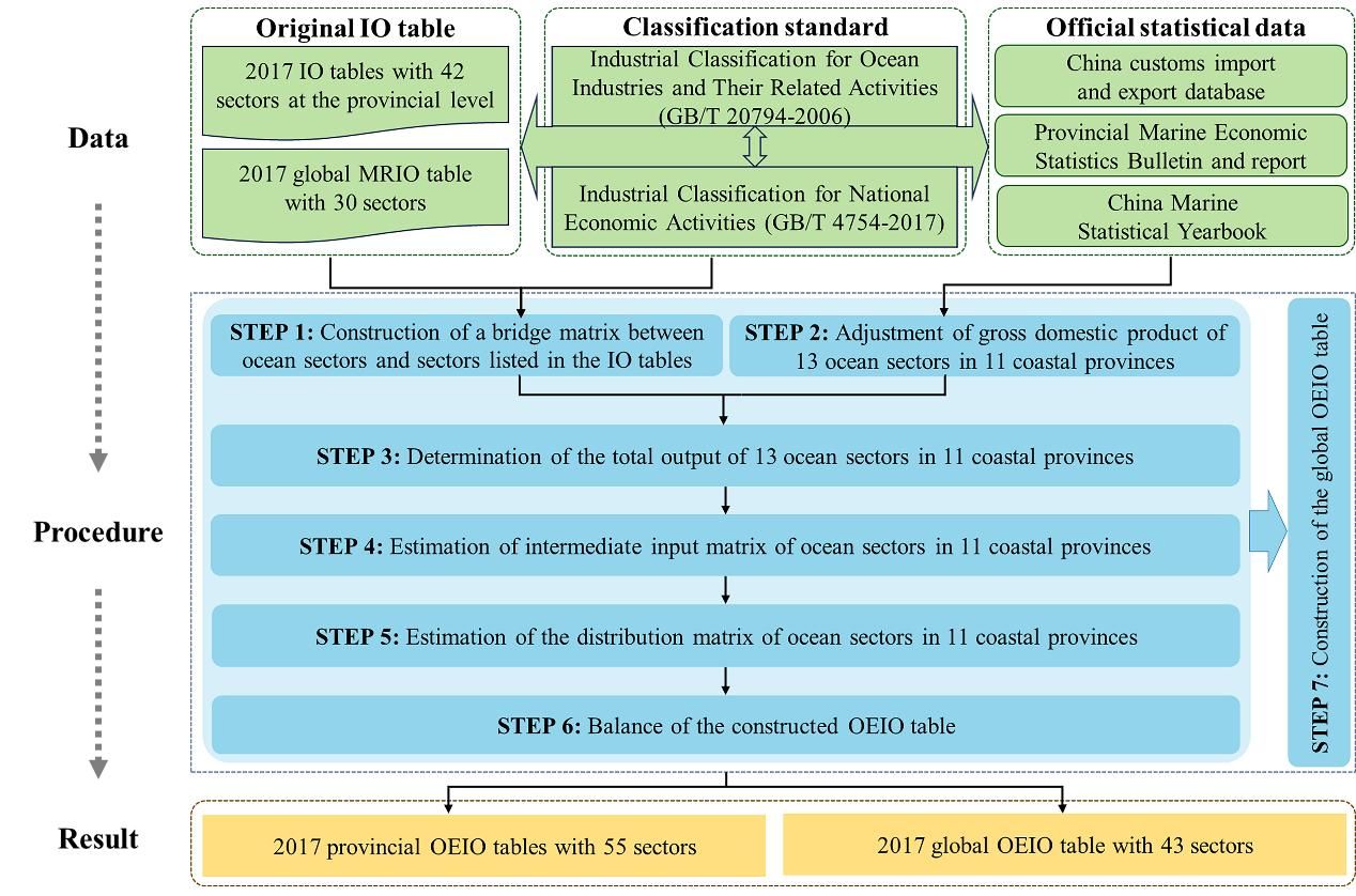 研究团队基于相关沿海省份统计局公布的2017年省级投入产出表和海洋经济统计数据,构建了涵盖中国 11 个沿海地区及其13个海洋部门的海洋经济投入产出表:首先,依据《海洋及相关产业分类》(GB/T 20794-2006)和《国民经济行业分类》(GB/T 4754-2017),通过构建桥矩阵将 13 个海洋部门与省级投入产出表中 42 个传统部门进行匹配。其次,收集整理了海洋经济在省级和部门级的国内生产总值数据,并通过数据调平获得相应部门的增加值。在此基础上,估算海洋产业的总产出及其相应的剥离系数,进而利用剥离系数从官方投入产出表的对应传统部门中拆分出海洋部门的中间投入矩阵和分配矩阵,并对省级海洋经济投入产出表进行调平。最后,基于该方法构建了包含中国沿海地区海洋产业的全球投入产出表。